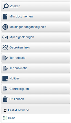 Een overzicht van de pagina's (maximaal 5) die door de ingelogde redacteur het laatst bewerkt zijn. Door te klikken op de tekst en het icoon voor Laatst bewerkt ververst u deze lijst.